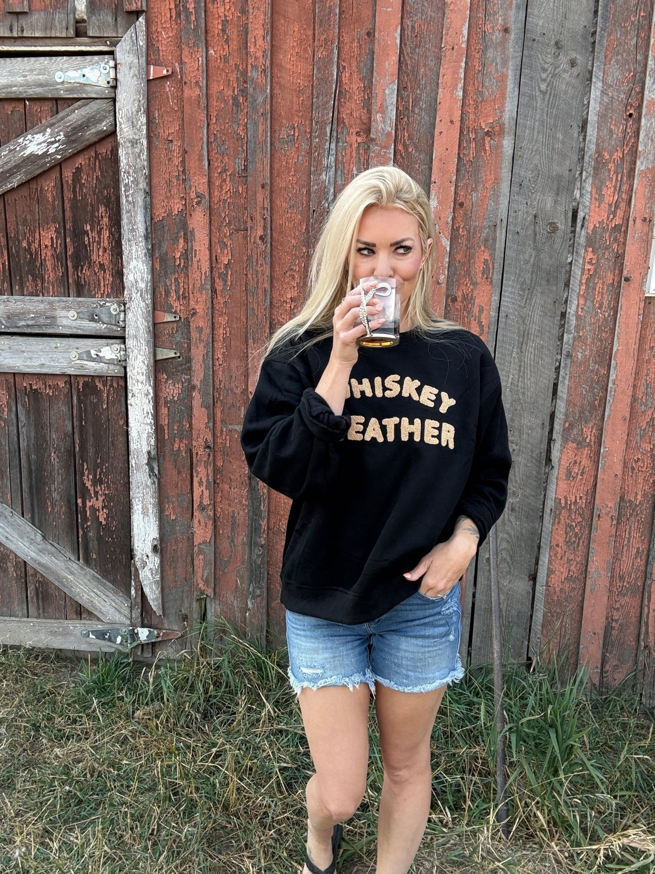 Black sweatshirt with tan “Whiskey Weather” textured text