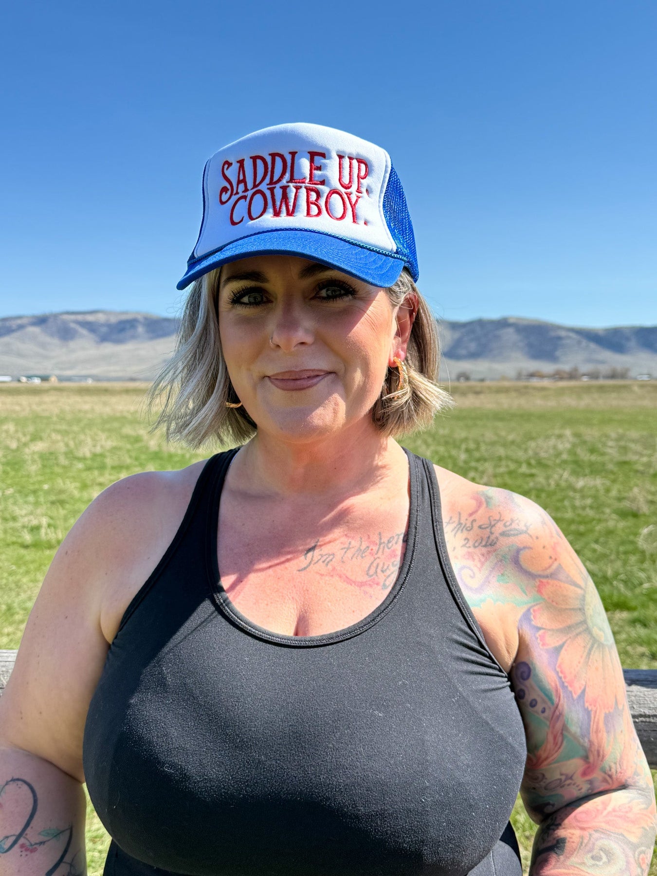 This royal blue and white embroidered trucker hat is made for those who live with the spirit of the West, whether you’re kicking up dust at the rodeo, heading out on the open road, or just repping your cowboy roots. Featuring bold red 'Saddle Up Cowboy' embroidery, this hat is a call to adventure, a nod to late-night honky-tonks, and a reminder to always ride tall. Adjustable for the perfect fit, it's your go-to for effortless Western style. So tip your brim, saddle up, and drift on.